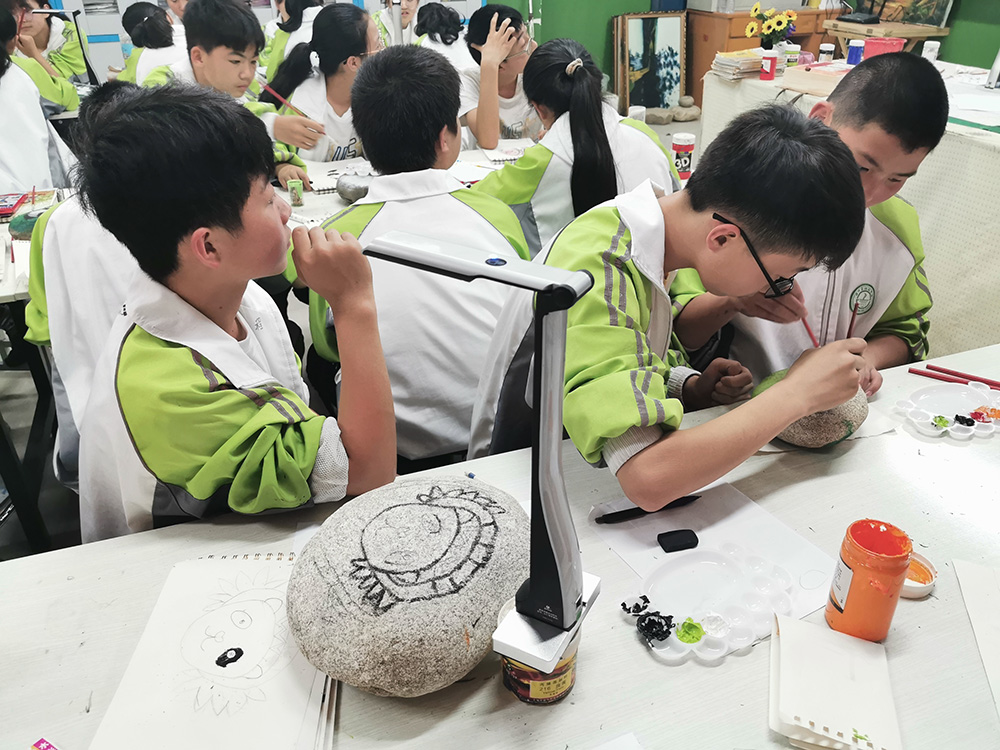 在熊貓石頭畫(huà)美術(shù)課上,師生們正在使用吉星捐贈(zèng)的未來(lái)智慧美術(shù)全互動(dòng)系統(tǒng)進(jìn)行美術(shù)教學(xué)。