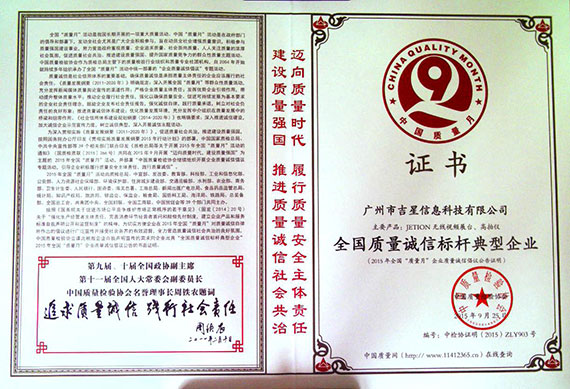 2015年9月,國家質量監督檢驗檢疫總局、國家工商行政管理總局、教育部、中國企業聯合會等39個部門共同開展了“邁向質量時代,建設質量強國”為主題的2015年全國“質量月”活動。本次活動中,廣州市吉星信息科技有限公司星在激烈的行業角逐中,榮獲中國質量檢驗協會頒發的“全國質量誠信標桿典型企業”榮譽證書。