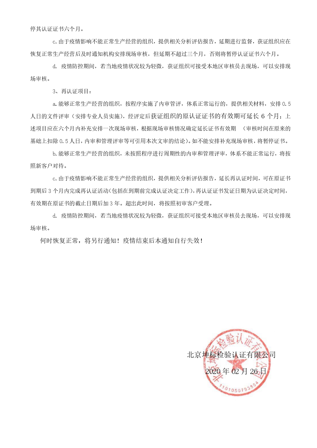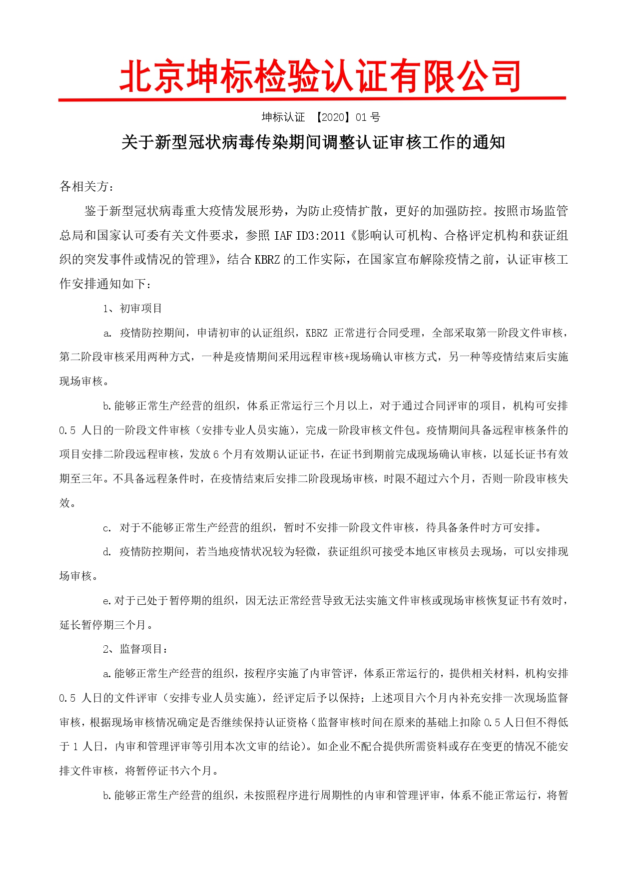 關于新型冠狀病毒傳染期間調(diào)整認證審核工作的通知