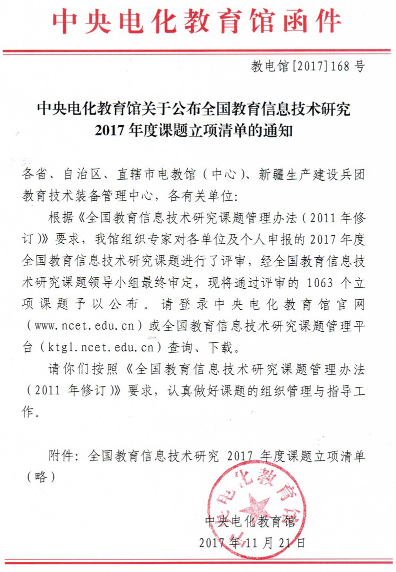 答:本課題屬于中央電化教育館全國教育信息技術(shù)研究2017年度重點課題。